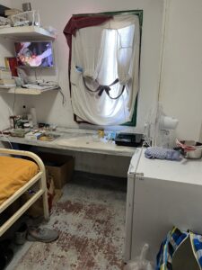 Concernant les fenêtres, nous avons aussi pu constater que le nouveau système, mis en place suite à une plainte du voisinage à cause du bruit, n’est pas adapté du tout. En théorie, il est censé avoir un courant d’air entre des petits orifices de la fenêtre fermée et un récupérateur d’air (souvent bouché) dans la pièce. En réalité, il n’y a pas un brin d’air. Les détenus se plaignent d’avoir le sentiment d’étouffer en plein été. La température ne baisse pas en dessous de 27°C la nuit selon une détenue qui dispose d’un thermomètre. Comme les détenus ne peuvent pas contrôler la température des douches, l’eau est souvent chaude et donc réchauffe la pièce autour de 30°C. Enfin, les pièces demeurent humides, le linge ne sèche pas et certaines détenues se plaignent des conséquences du manque d’aération sur leur santé.
